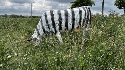 Ist es eine Kuh oder doch ein Zebra? Das fragen sich gerade viele, die am Kreisverkehr bei Gottfrieding im Landkreis Dingolfing-Landau vorbeifahren. Dort steht eine grasende Kuh aus Kunststoff, die zum Verwechseln ähnlich mit einer echten Kuh ausschaut. Unbekannte haben jetzt jedoch diese lebensgroße Kuh mit schwarzen Streifen beschmiert, sodass man meinen könnte, es handele sich um ein Zebra. Die Polizei ermittelt jetzt und der Kreisbauhof will die Schmierereien in den nächsten Tagen beseitigen.